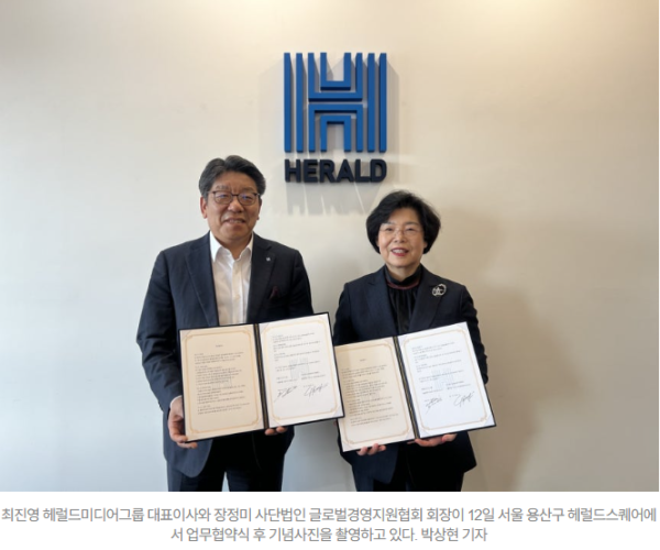 헤럴드미디어그룹과 사단법인 글로벌경영지원협회는 12일 글로벌 비즈니스 협력 강화를 위한 업무협약(MOU)을 체결했다.