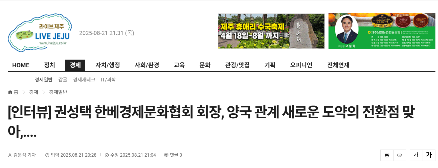 ▲사진= 권성택 한베경제문화협회 회장이 인터뷰를 하고 있다= 권성택 코베카회장 제공 ⓒ라이브제주